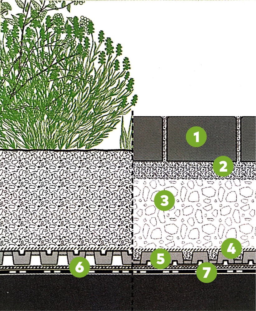 Este sistema proporciona seguridad y larga duración en los espacios ubicados sobre los estacionamientos, garantizando impermeabilidad, drenaje y aislamiento térmico y acústico mientras permite implementar zonas peatonales, transitables y ajardinadas.